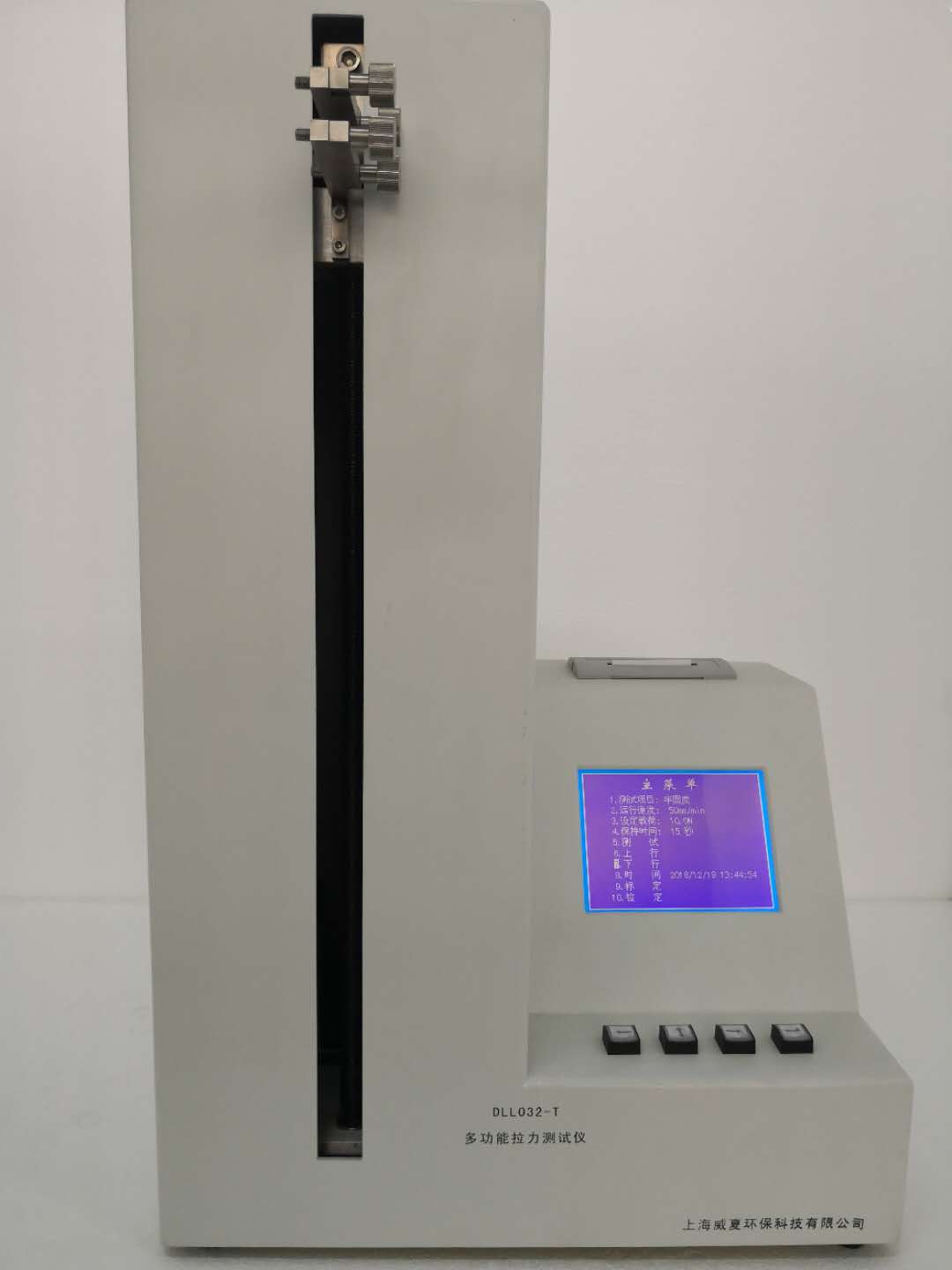 采用PLC可编程控制器,5.7英寸彩色液晶显示屏,中文菜单显示、力值传感器、测力机构、传动机构、机载打印机等组成。中文菜单显示,人机对话设定各项参数自动运行测试;实时显示拉力的最大值、平均值,自动判别合格与否,并由打印机打印出测试数据。仪器终身免费升级。