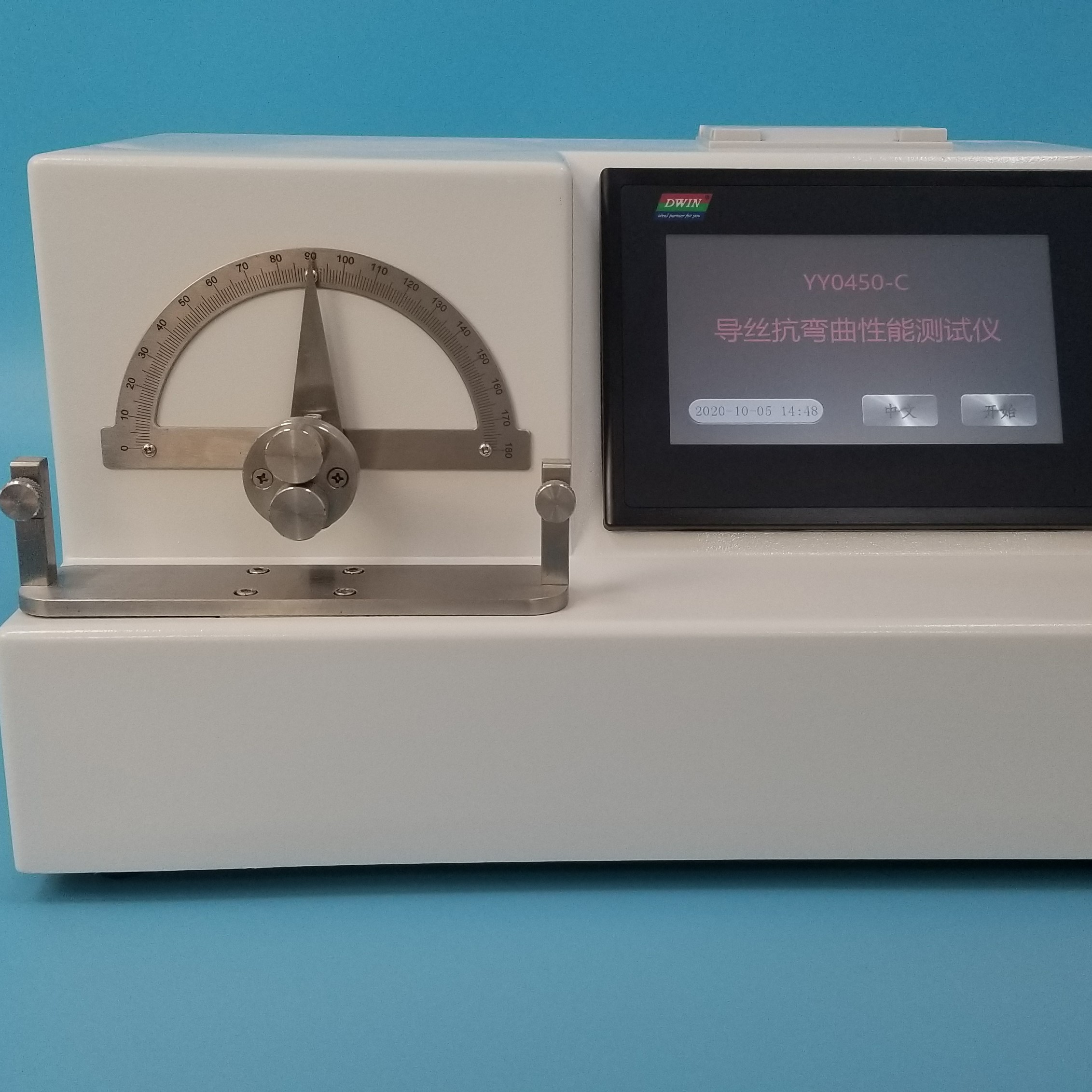 采用7英寸K600+内核/点阵式65色800*480分辨率的触摸屏,中英文菜单显示。具有公称规格、试验次数、打印、测试、左转、右转、时间等参数。由键盘控制触摸显示屏上的菜单,自动对被测导丝进行反向弯曲和伸直,机载打印测试结果。